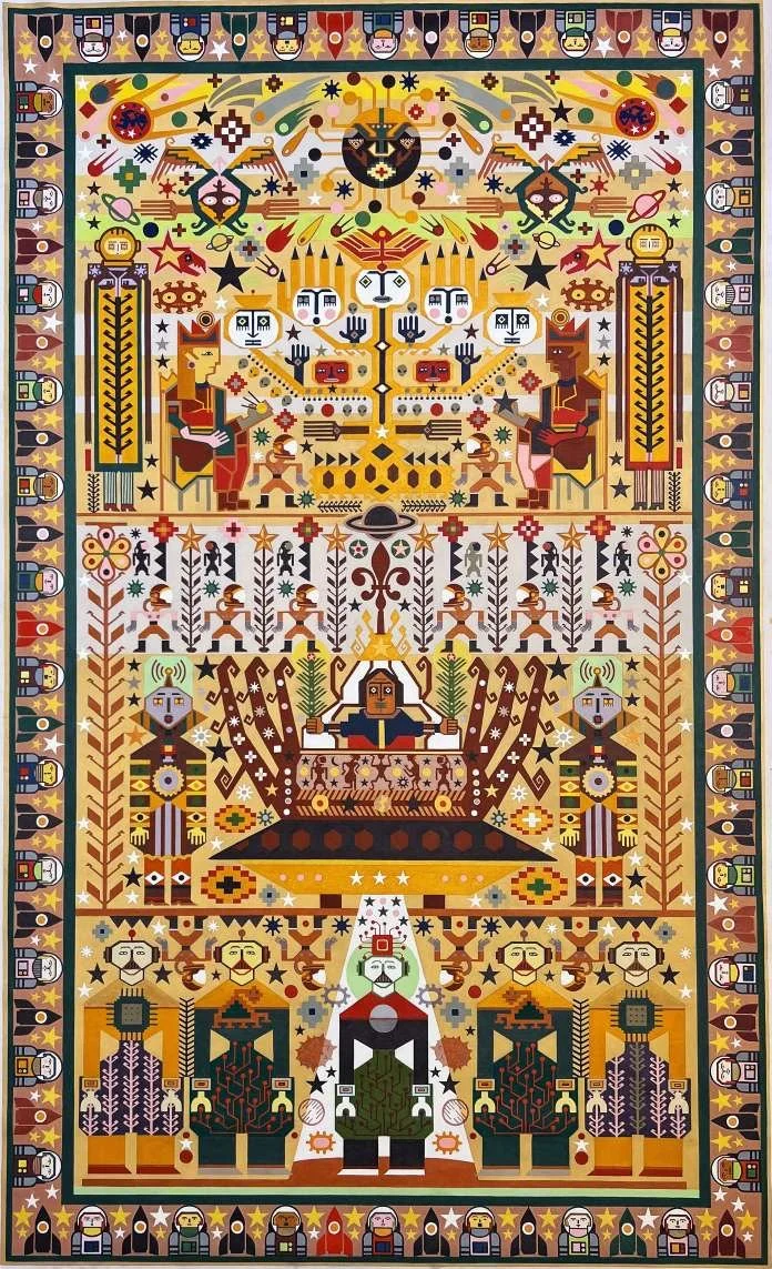 Rug Paintings emerge from a dreamlike dialogue with the world of rugs, carried through oil on canvas or linen. Traditional Persian motifs echo through layers of paint, merging with invented forms and modern presences to create an interwoven realm beyond time, where pattern lives, shifts, and tells new stories. Each work invites the viewer into a meditative space where memory, movement, and imagination quietly intertwine.