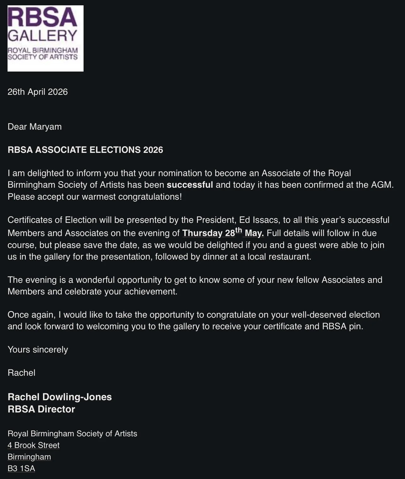 Maryam is honoured to announce her election as an Associate of the Royal Birmingham Society of Artists (RBSA) in 2026.